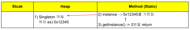 private static Singleton instance = new Singleton();이 코드가 실행되면,- Singleton 객체가 힙(Heap) 영역에 생성. 주소 위치는 예시로 0x12345라 칭함