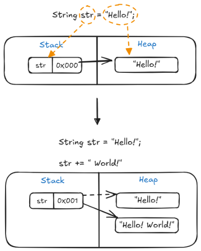 기존 문자열을 수정하는 대신, 변경된 내용을 가진 새로운 String 객체를 힙에 생성하고, 변수에는 그 새 객체의 참조값을 다시 대입하는 방식으로 동작한다.