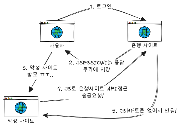- 악성 사이트의 JavaScript가 은행 API로 요청을 시도한다.
