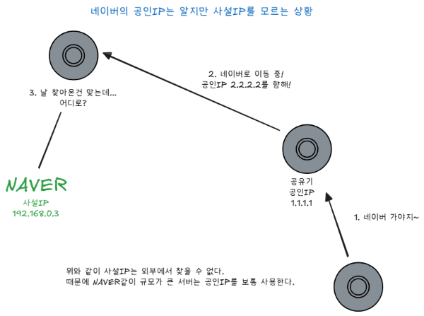 naver.com에 접속하려 할 때, 서버가 사설 IP만 가지고 있다면 인터넷 망에서 해당 서버를 식별하거나 길을 찾을 수 없습니다. - 라우팅 불가: 사설 IP는 내부 네트워크 전용이므로, 전 세계적인 Internet환경에서는 라우팅(경로 배정)이 되지 않는 주소입니다.