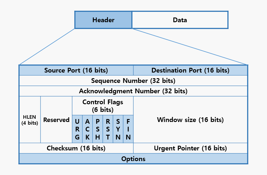 - P (PSH): ํธ์ ํ๋๊ทธ. ๋ฐ์ดํฐ๋ฅผ ๋ฒํผ๋ง ์์ด ์ฆ์ ์ ์กํ๋๋ก ์์ฒญ.
