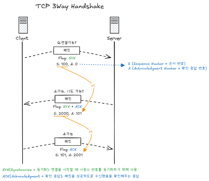 (์ด๋ ํด๋ผ์ด์ธํธ๋ "์ฐ๊ฒฐํด๋ ๋ ๊น์?" ์์ฒญ์ ๋ณด๋) - SYN + ACK