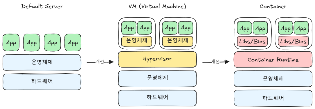 컨테이너 기술컨테이너를 이해하려면 기존 서버 → VM → 컨테이너 순서로 알아야 합니다. 1. 기존 서버하나의 OS 위에 여러 App 실행문제: App1 메모리 폭주 → App2까지 느려짐2. 가상머신(VM)기존 서버의 문제점을 개선OS → 하이퍼바이저 → Guest OS별로 App 격리문제: 용량을 많이 차지한다. OS 여러 개 → 용량 GB 단위 개념 등장 년도1964-67: IBM CP-40/CP-67 (최초 하이퍼바이저 개념)1972: IBM VM/370 (상용화)1999: x86 VM (VMware)3. 컨테이너 기술기존 가상머신의 문제점을 개선OS를 각각 가지지 않고 공유함장점:용량 MB 단위시작 초 단위서버 밀도 2-3배개념 등장 년도1979: chroot (격리 기반)2000: FreeBS..